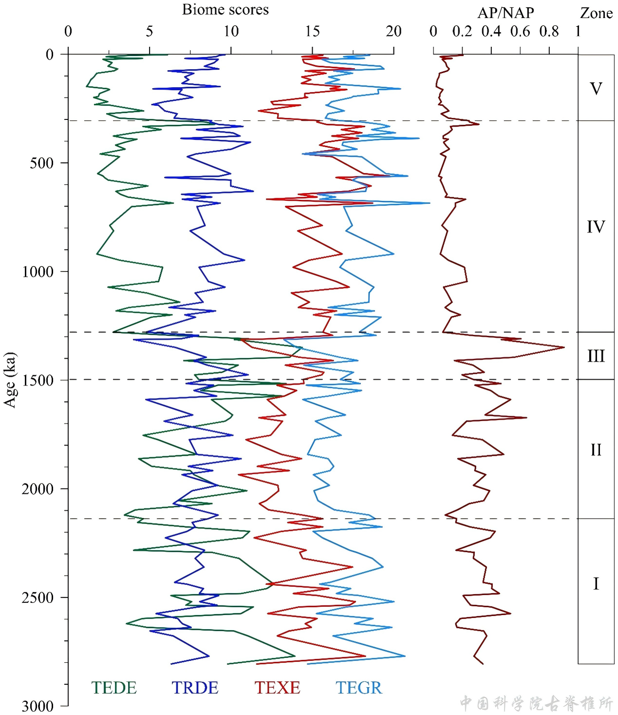 LN-1钻孔位于华北平原。古地磁测年结果显示,其岩芯底部年龄至少为2.68 Ma;而岩芯顶部9.6米处的年龄由14C测年法厘定为19,310 ± 70 cal yr BP。从LN-1岩芯中共提取了121份花粉样本进行鉴定。花粉证据显示,中国北方的植被在约1.2 Ma前后发生了显著转变:从2.68 Ma以来占主导的开阔落叶阔叶林,更替为草原及灌木草原(Zhou等,2023)。研究团队基于该花粉数据,分别利用生物区系法和转换函数法定量重建了古植被与古气候。