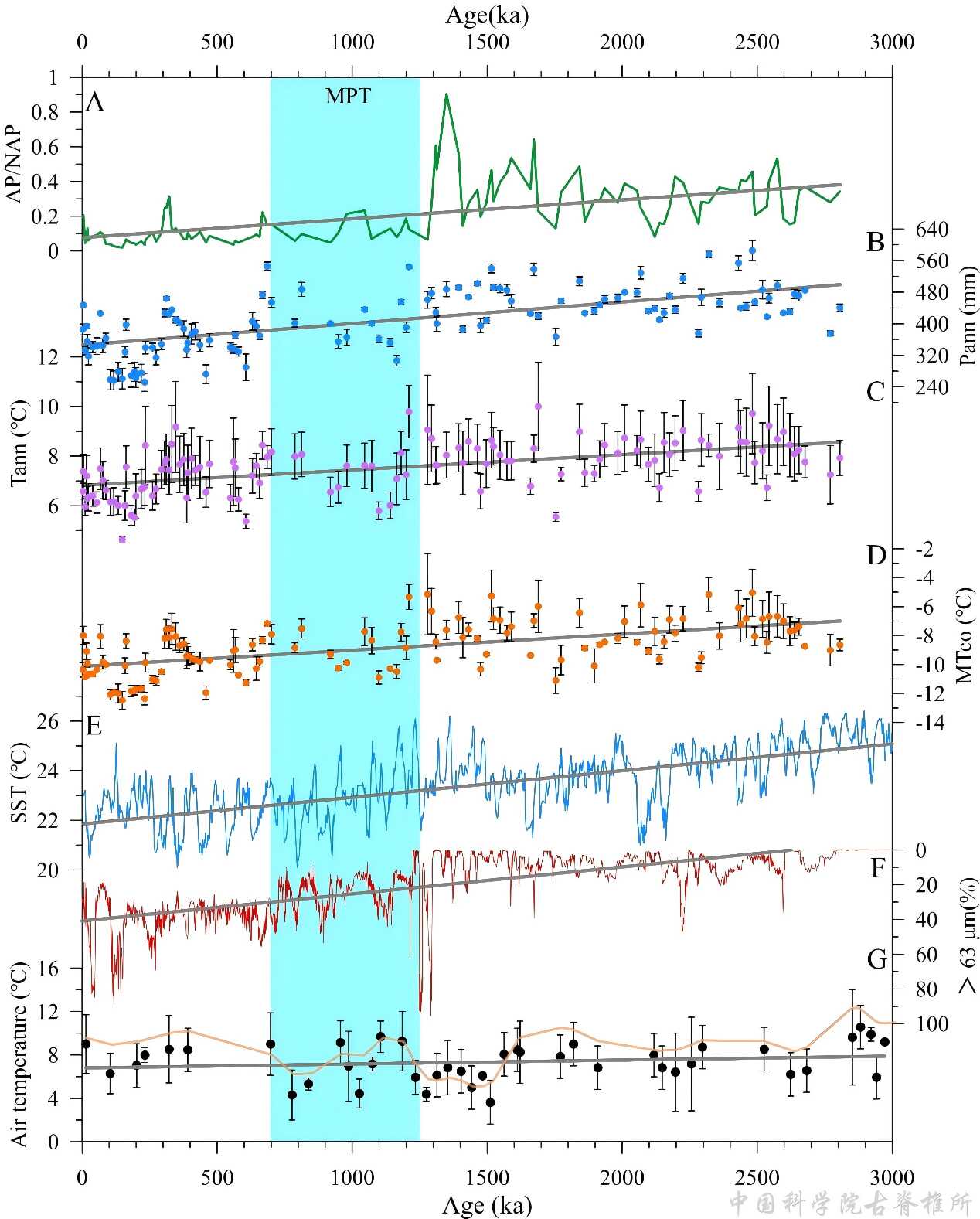 图3. 基于LN-1岩芯及其他古气候记录的重建结果对比。(A) AP/NAP比值;(B) 年均降水量(Pann);(C) 年均气温(Tann);(D) 最冷月平均气温(MTco); (E) 热带海表温度(SST)(Herbert et al,2010);(F) 靖边剖面砂含量(Ding et al,2005);(G) 灵台剖面基于钙结核团簇同位素的空气温度(Yang et al,2024)。(华杰群和马嘉成 供图)