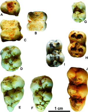 左图:裴氏猪的上颊齿(A-J)和下颊齿(K-N),齿冠由丘形的齿尖组成。下犬齿的横切面(O)近于三角形,侧面(P)弯刀形 右图:小猪的上颊齿(A-F)和下颊齿(G-J),齿冠由丘形的齿尖组成