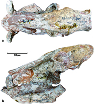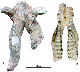 左图:李氏野猪的下颌骨,左侧的雄性下颌骨粗壮且犬齿粗大,右侧的雌性下颌骨相对纤细,犬齿较小 右图:修复的李氏野猪头骨背侧(a)和左侧(b)