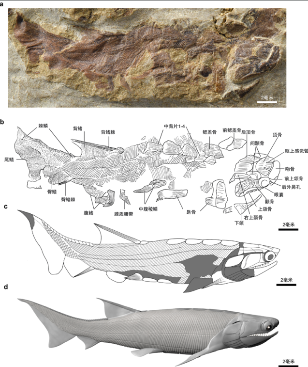 图2 始骨鱼化石及复原。a.始骨鱼照片;b.始骨鱼标本线图;c.始骨鱼复原线稿;d.始骨鱼三维复原灰模。