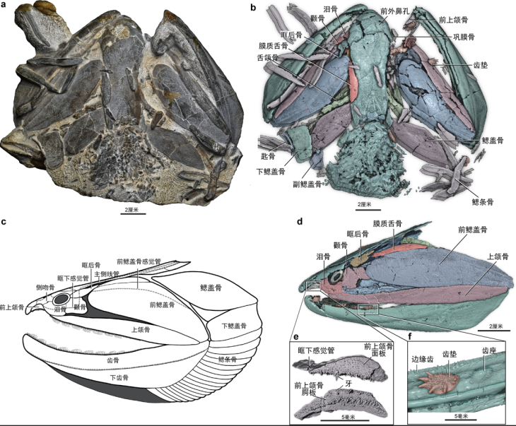 图3 钝齿宏颌鱼化石及高精度CT重建。a.宏颌鱼照片;b.宏颌鱼三维重建;c.宏颌鱼头部骨片复原线图;d.宏颌鱼头部骨片位置复原;e.前上颌骨放大,显示与全颌盾皮鱼类相似的面板与腭板结构;f.下颌局部放大,显示着生在齿座上的齿垫结构。