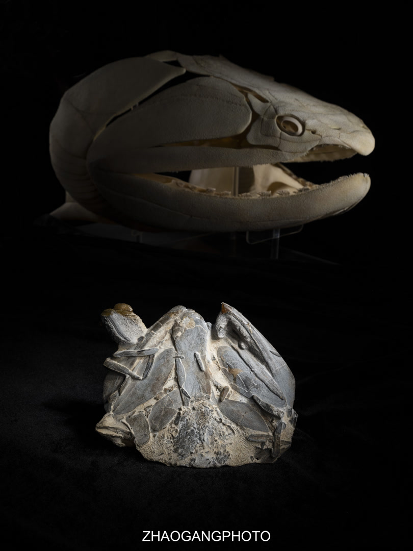钝齿宏颌鱼化石(下)和头骨复原模型(上)(赵纲 摄)