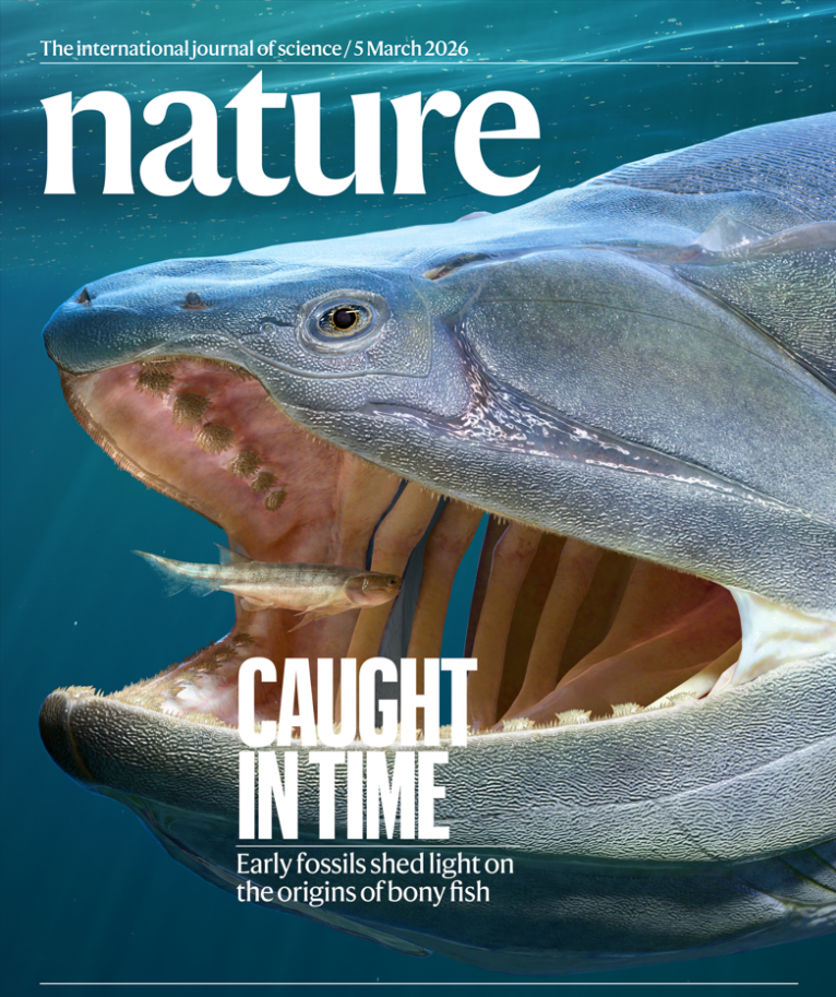 始骨鱼(中)和宏颌鱼三维复原。Nature封面