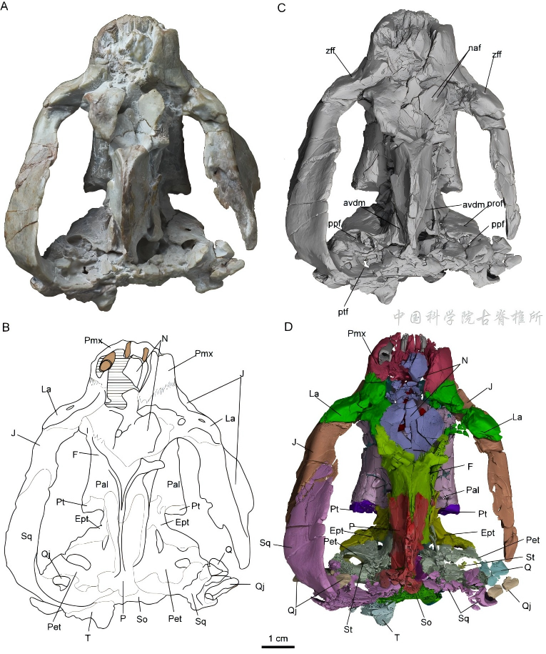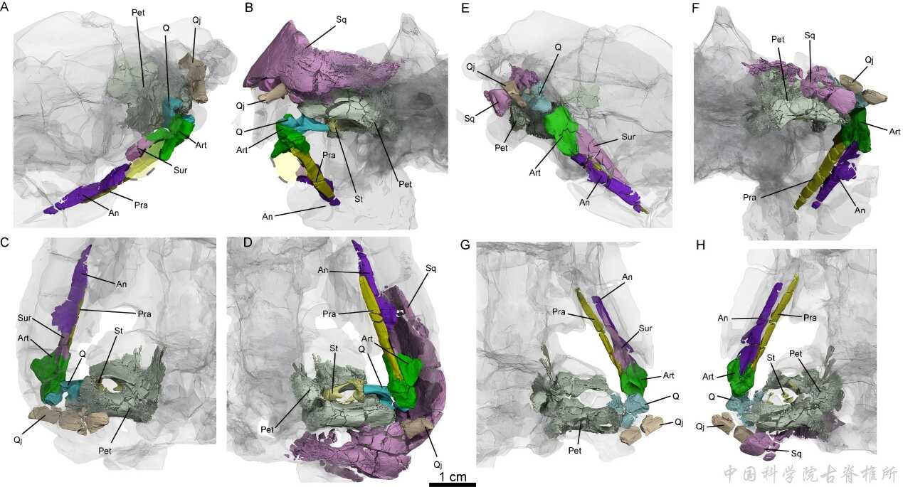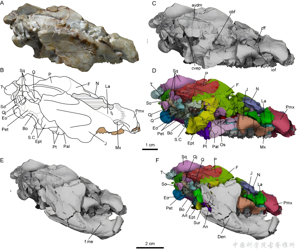 该标本呈三维立体保存,体型较小、颊齿未完全萌发,下颌上升支后倾,可能代表了一个亚成年个体。研究人员对标本进行了三维重建,分割出了头骨上所有骨块,表现了每一骨块的具体位置和三维立体形态以及不同骨块之间的接触关系和缝合线等细节,并对每一块骨骼的三维六面形态都进行了详细的描述和图示,并与所有已知三列齿兽类动物进行了广泛的形态对比。依据该标本具有的特征性的宽大颧弓、缩短的吻部、上颊齿2-3-3的齿尖式、方骨具有较小的背部关节面和向背部弯曲的镫骨突等特征,将其鉴定为似卞氏兽属中的自贡似卞氏兽(Bienotheroides zigongensis)。似卞氏兽属的化石最早发现于重庆万县,于1982年报道于杨钟健的遗著中,并在1984年由孙艾玲进行了进一步研究;而自贡似卞氏兽的化石则在四川自贡和新疆都有发现,但至今为止还未经历过对整个头骨的详细形态描述,许多骨骼学特征也一直处于未知状态。