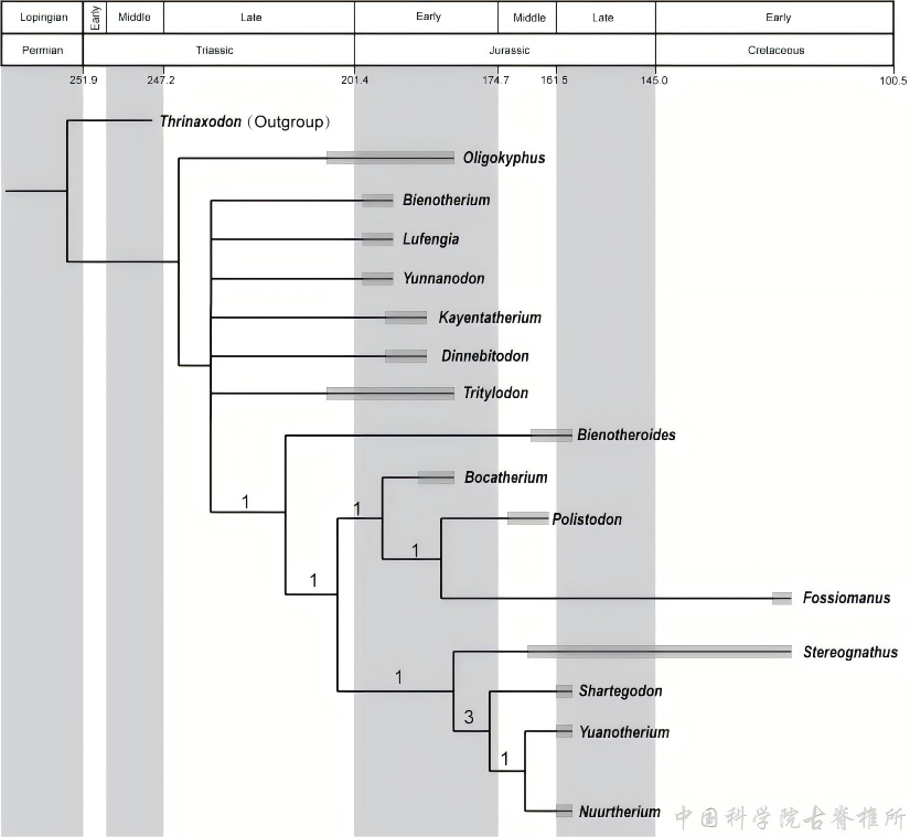 在系统学方面,目前一般认为三列齿兽科属于真犬齿兽类(Eucynodontia)中的进步颌兽类(Probainognathia)。但对于三列齿兽科内的十余个属之间的系统发育关系,却几乎是一项研究空白。此前对于这方面的研究大多受制于三列齿兽类的化石标本不完整、大量标本尚未经过详细描述等不利因素,所使用的特征矩阵存在大量信息缺失,建立的演化树也难以有效反映三列齿兽科内各属的系统发育关系。本研究经过了对似卞氏兽的详细描述后,补充了大量可用于系统发育分析中的形态学信息,同时也通过对既往标本和文献的再研究,补充了卞氏兽、禄丰兽等中国三列齿兽的形态信息,极大改善了这些属的特征完整度,并对此前研究中使用的特征矩阵进行了大幅扩充,改进了外类群的选取,以获得更稳定的系统发育框架。最终,研究人员建立的演化树成功区分了大部分三列齿兽类的系统关系,并揭示了似卞氏兽处于三列齿兽科内较为进步的位置。同时,研究人员也基于系统发育分析的结果进行了进一步探讨,总结了在三列齿兽类的演化历程中发生的一系列形态学变化,如吻部缩短、上颌骨退缩、上颊齿齿尖减少等。