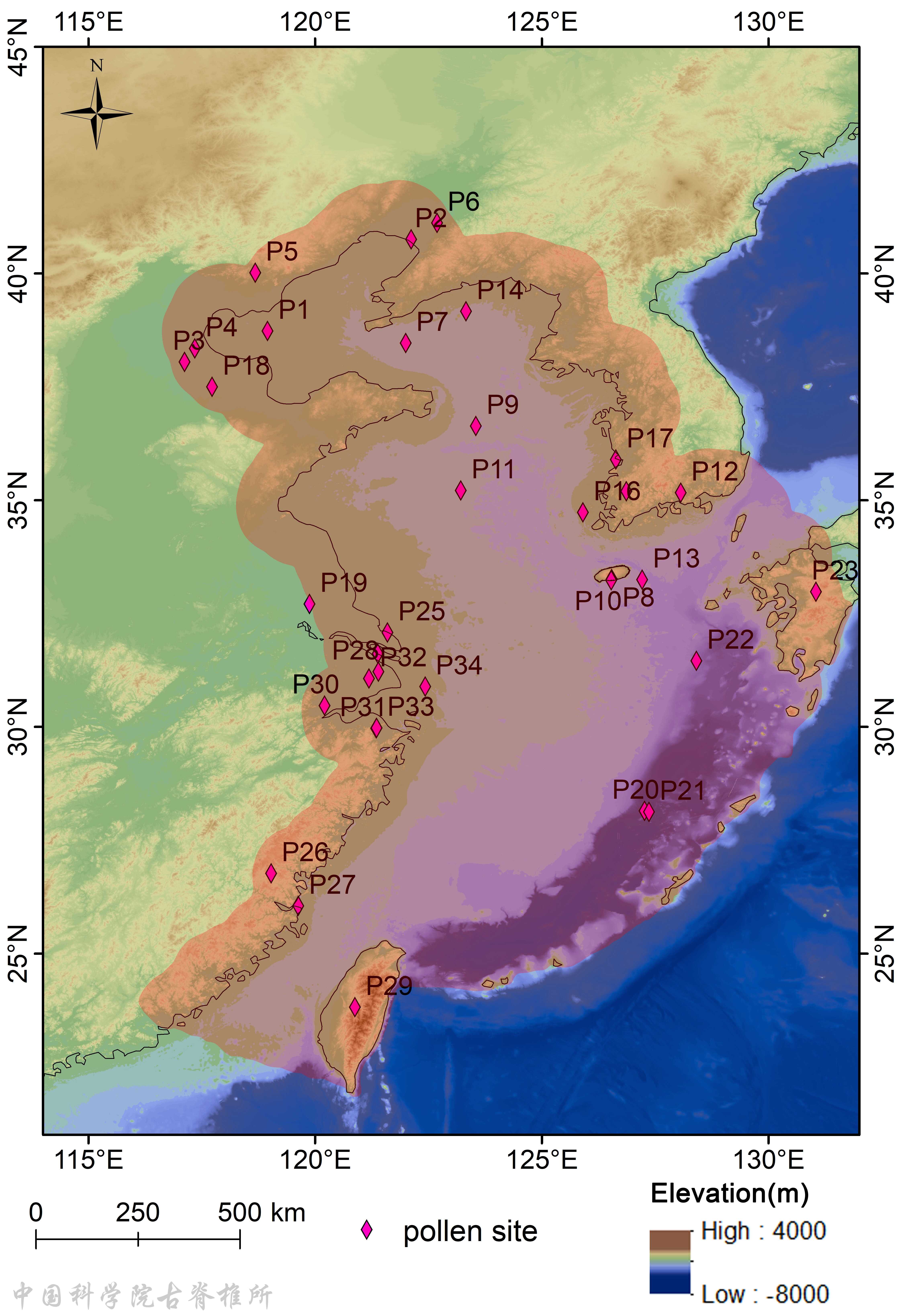 图1 研究区域示意图(红色阴影区域,显示本研究所选已发表孢粉点位)。