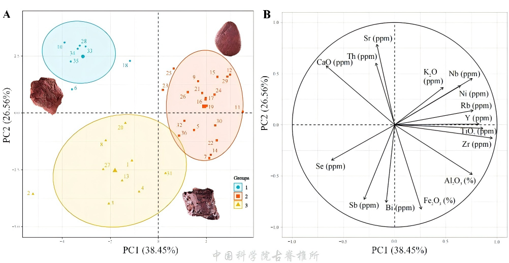基于p-XRF结果的主成分分析和聚类分析,佛洞地遗址的赭石可分为三类,并呈现出历时性变化趋势(图2)。一类赭石富含Ca元素(重量百分比高达50.61%);二类赭石以较高含量的铁质与黏土成分为特征,表现为富铝(Al)、钾(K)和钛(Ti)元素;而三类赭石的Fe含量则是相对最高的一组(其重量百分比介于24.52-88.49%)。佛洞地史前人群对赭石资源的利用整体较为稳定,三类赭石在三期文化层中均有出现,呈现出“广谱化”特征。但在早期阶段(A期和B期),人类更倾向于采集二类赭石;到了晚期(C期),一类和三类赭石的比例有所增加,可能指示了人类对赭石原料的偏好有所转变。