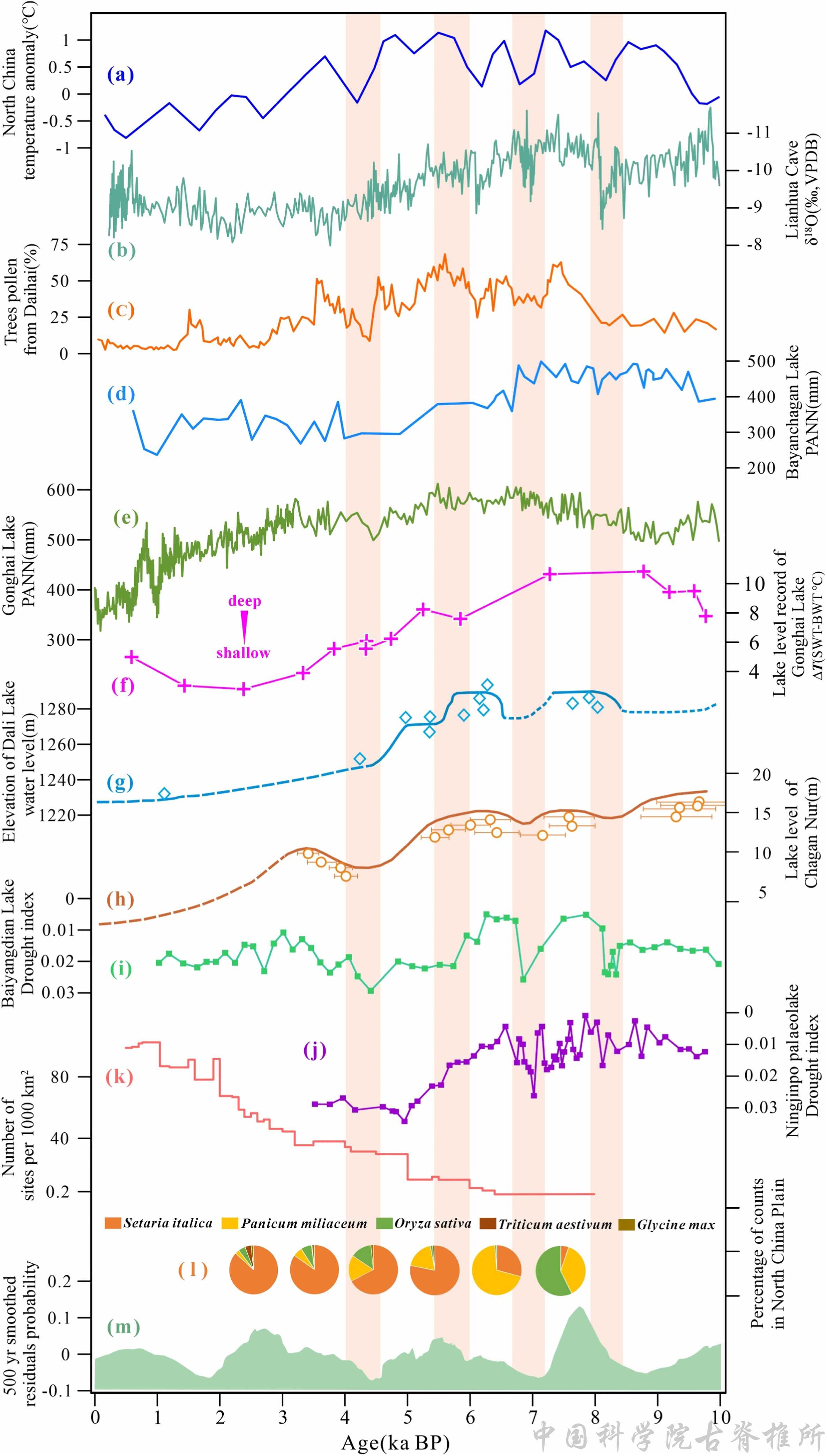 图2 华北地区人类活动指标与古环境记录的综合对比。(a)华北地区全新世温度记录(侯光良,2012);(b)山西莲花洞石笋δ¹⁸O记录(Dong et al., 2012);(c)岱海乔木花粉百分比(Xiao et al.,2004);(d、e)基于孢粉数据重建的巴彦查干和公海降水量变化(Jiang et al., 2006; Chen et al., 2015);(f、g、h)公海、达里湖及查干淖尔的湖泊水位变化(Cao et al., 2021; Goldsmith et al., 2017; Li et al., 2020);(i、j)白洋淀和宁晋泊干旱化指数(Shen et al., 2018; Li et al., 2020);(k)华北地区考古遗址数量变化(Hosner et al., 2016);(l)华北平原农作物绝对数量百分比变化(本研究);(m)过去1万年中国人口变化趋势(Wang et al., 2014)。粉色阴影表示新石器时代的气候干旱事件。(李生芮 供图)