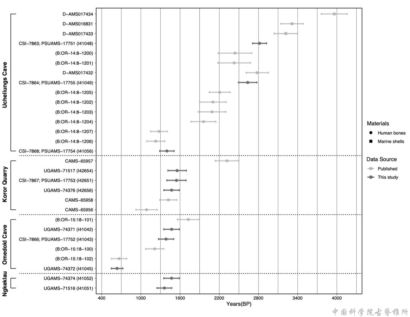 研究显示,帕劳群岛早期居民的遗传构成中,约60%来源于东亚(即南岛语族人群),40%来自新几内亚岛(即巴布亚人群),这一比例与现代帕劳人群的遗传背景高度一致(图2)。通过同位素定年,研究者发现其中两例个体的生存年代为2900-2500 calBP,正处于帕劳群岛有现代人类定居的早期(图3),这也使帕劳成为迄今所知远大洋洲地区群体遗传连续性最长的案例。