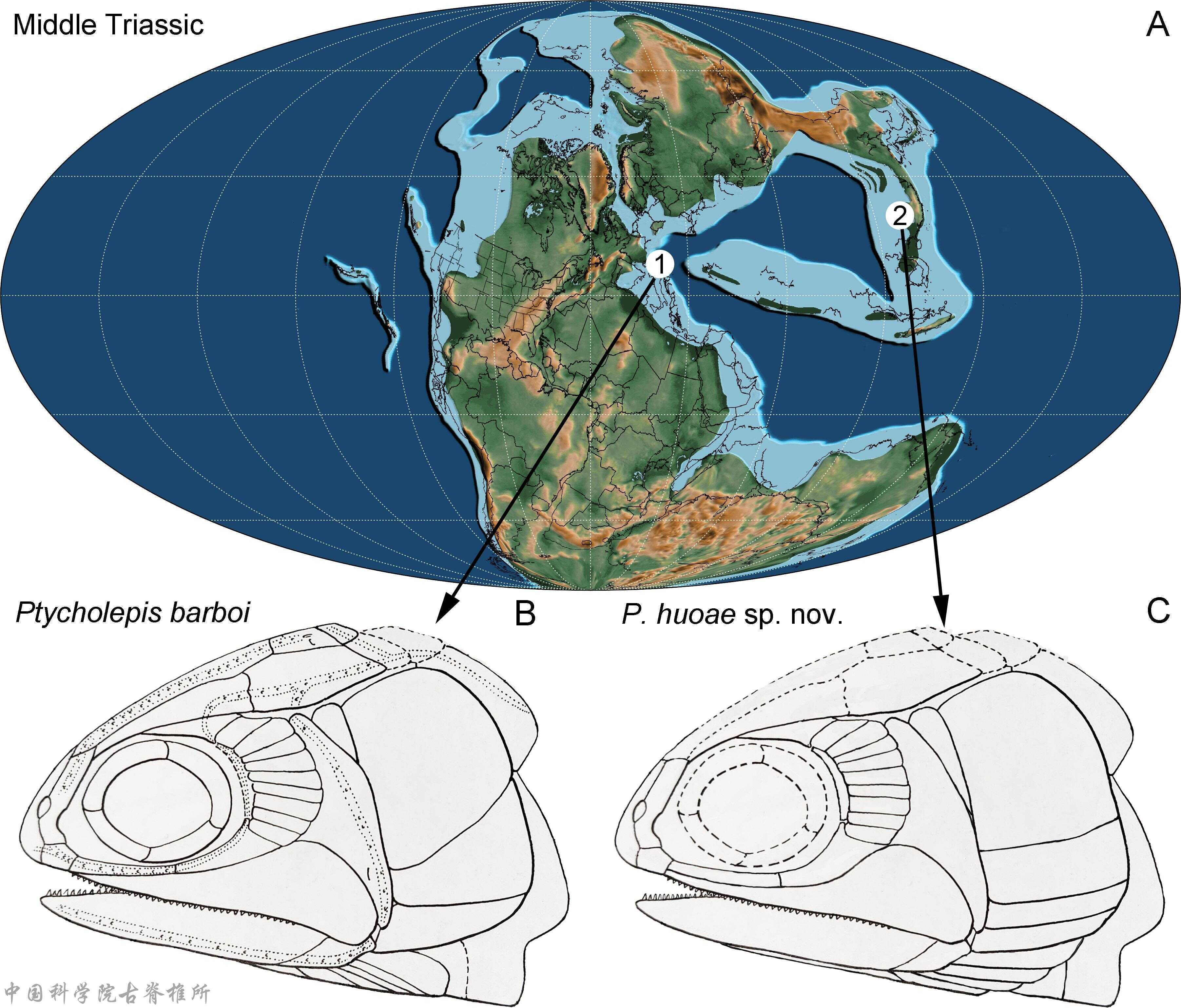 褶鳞鱼属(Ptycholepis)属于已灭绝的辐鳍鱼类,其生存年代从三叠纪中期一直延续到侏罗纪。该属的模式种产自于德国、英国和法国的早侏罗世地层,过去最早的褶鳞鱼属物种发现于意大利、瑞士交界的圣乔治山地区(Monte San Giorgio)拉丁阶/安尼阶界线附近(约 2.42 亿年前)。在我国云南发现的霍氏褶鳞鱼以其较少的头骨纹饰、不太分化的鳃条骨和独特的胸鳍分节方式易与其他褶鳞鱼物种相区别。褶鳞鱼属新物种的发现和研究将褶鳞鱼属的起源时间提前了200万年,丰富了对该属形态多样性的认识,填补了亚洲海相褶鳞鱼科的空白,因此具有相当程度的科学意义。