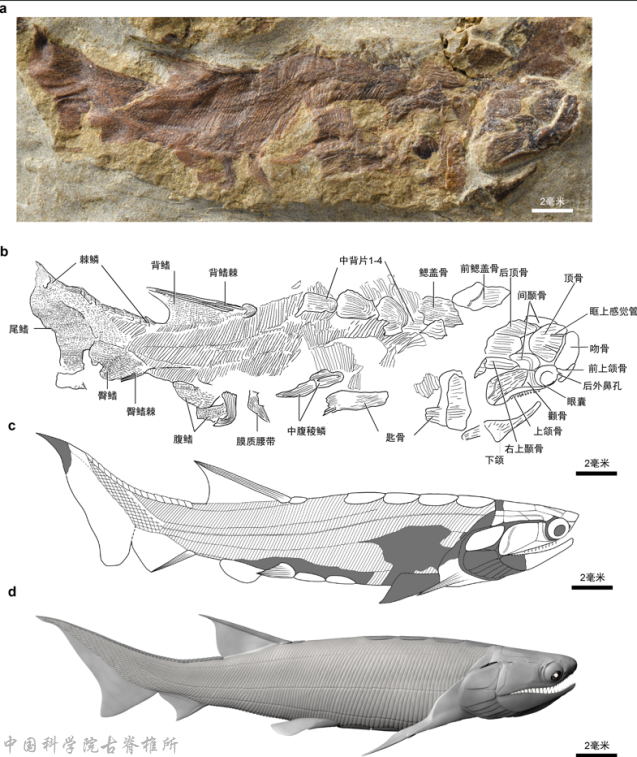 3始骨鱼化石及复原。a.始骨鱼照片;b.始骨鱼标本线图;c.始骨鱼复原线稿;d.始骨鱼三维复原灰模。
