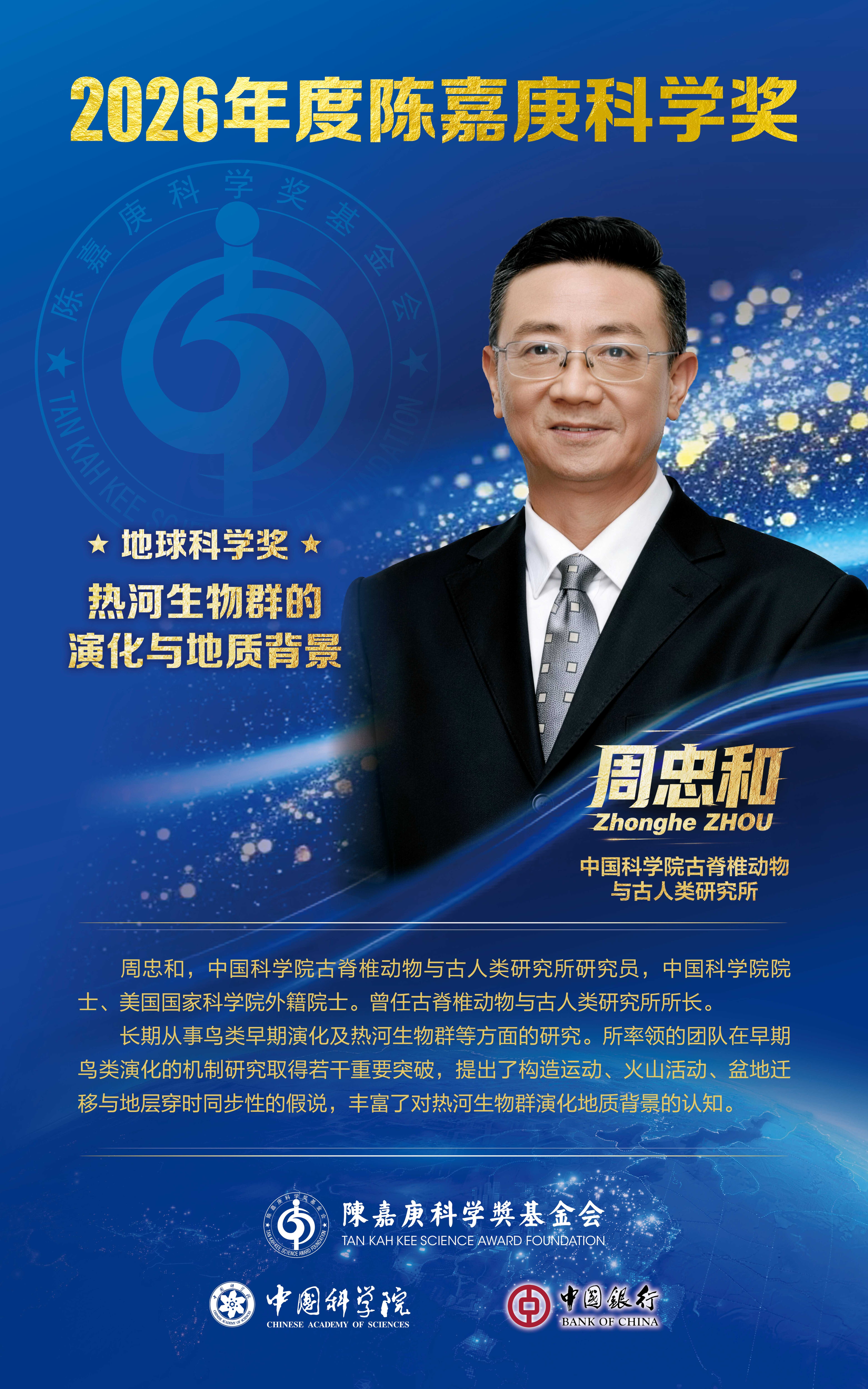 发布会由中国银行行政事业机构部总经理、陈嘉庚科学奖基金会理事宁敏主持。会上,中国科学院学部工作局局长、陈嘉庚科学奖基金会理事兼秘书长王笃金宣读2026年度陈嘉庚科学奖和陈嘉庚青年科学奖获奖名单。2026年度奖项评选工作于2025年5月正式启动,历经同行专家通信评审、各专业评委委员会评审及总评奖委员会终评等程序,最终评选出6项陈嘉庚科学奖获奖项目和12位陈嘉庚青年科学奖获奖人。其中陈嘉庚地球科学奖获奖项目是“热河生物群的演化与地质背景”,项目主要完成人为我所周忠和研究员。