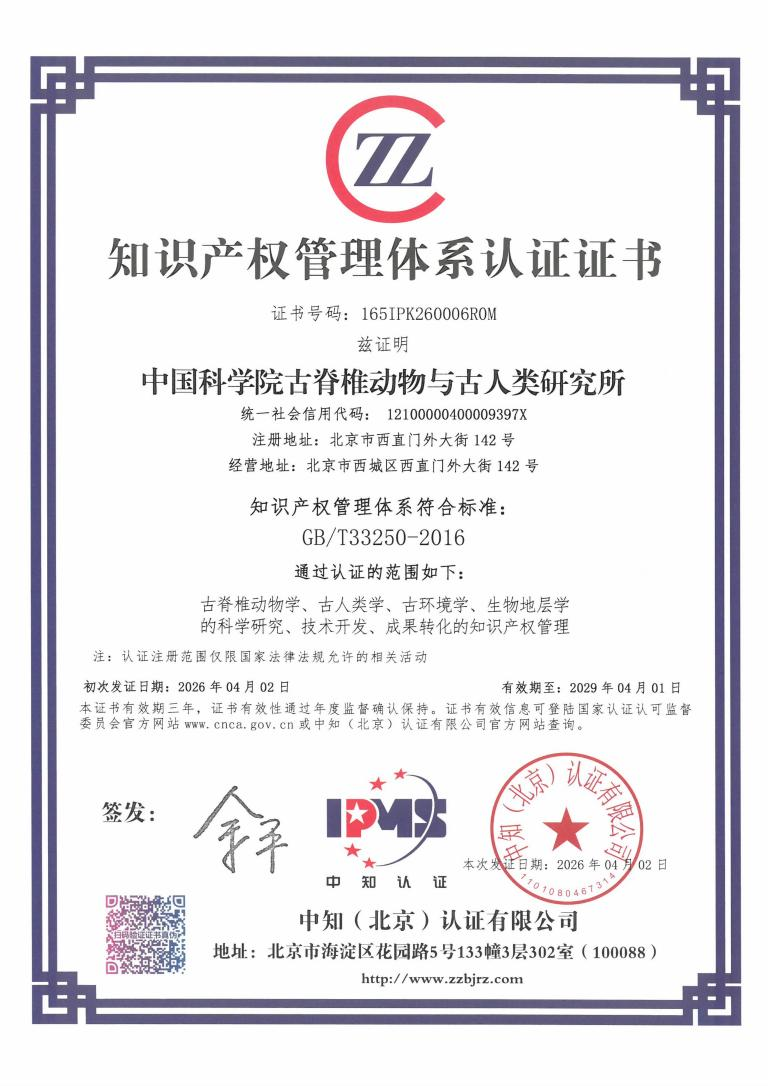 近日,中国科学院古脊椎动物与古人类研究所(以下简称“古脊椎所”)正式通过《科研组织知识产权管理规范》(GB/T 33250-2016)国家标准审核,并于2026年4月获得知识产权管理体系认证证书。这标志着古脊椎所在知识产权规范化管理方面迈上了新台阶。